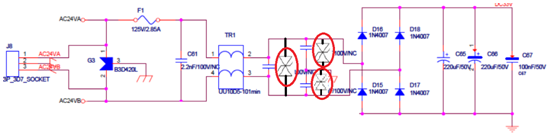 To change circuit design, due to the space limit of PCB, BVSMBJ58C2H (SMB package, 3000W) is chosen for optimizing solution, it equals to BV-SMDJ58CA. After test on AC24V port, AC24VA passed, but AC24VB failed and equipment damaged due to burned diodes in bridge rectifier.