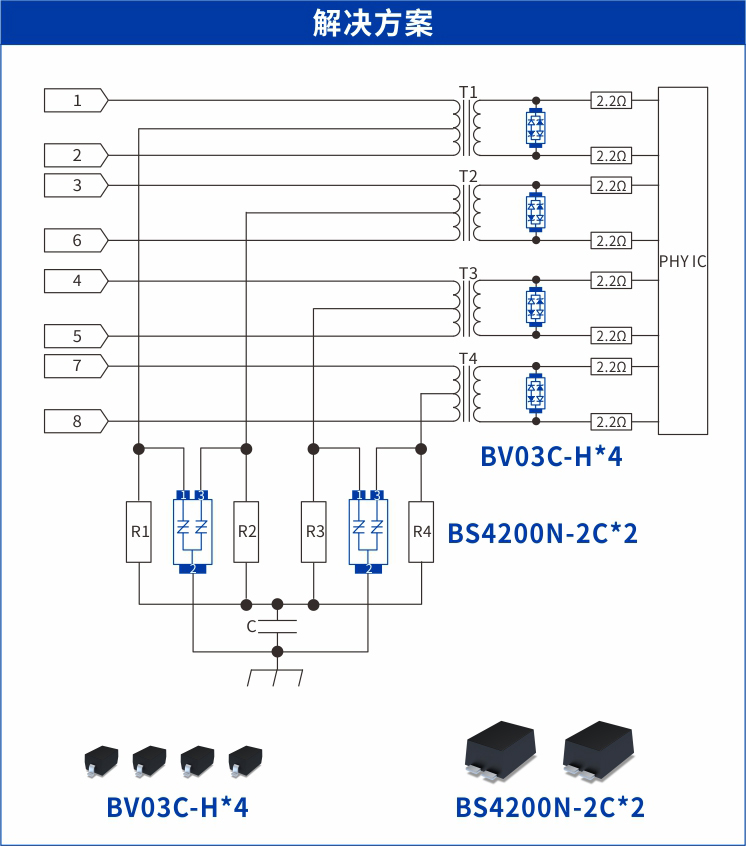 第二级防护,为满足千兆网口高速数据传输对防护器件性能参数设计要求,槟城电子推荐使用低容ESD器件BV03C-H,工作电压 3.3V,结电容1.5pF,峰值脉冲电流25A,采用SOD323封装,并符合IEC 6100-4-2 (ESD)±30kV (空气放电) 和±30kV (接触放电) 标准。该方案在75℃高温环境下能保证数据传输无丢包,可吸收差模浪涌残余能量,有效保护PHY,同时后级可以串接2.2Ω电阻作为退耦器件,阻碍浪涌或ESD电流往后级流动迫使BV03C-H快速充分地导通。